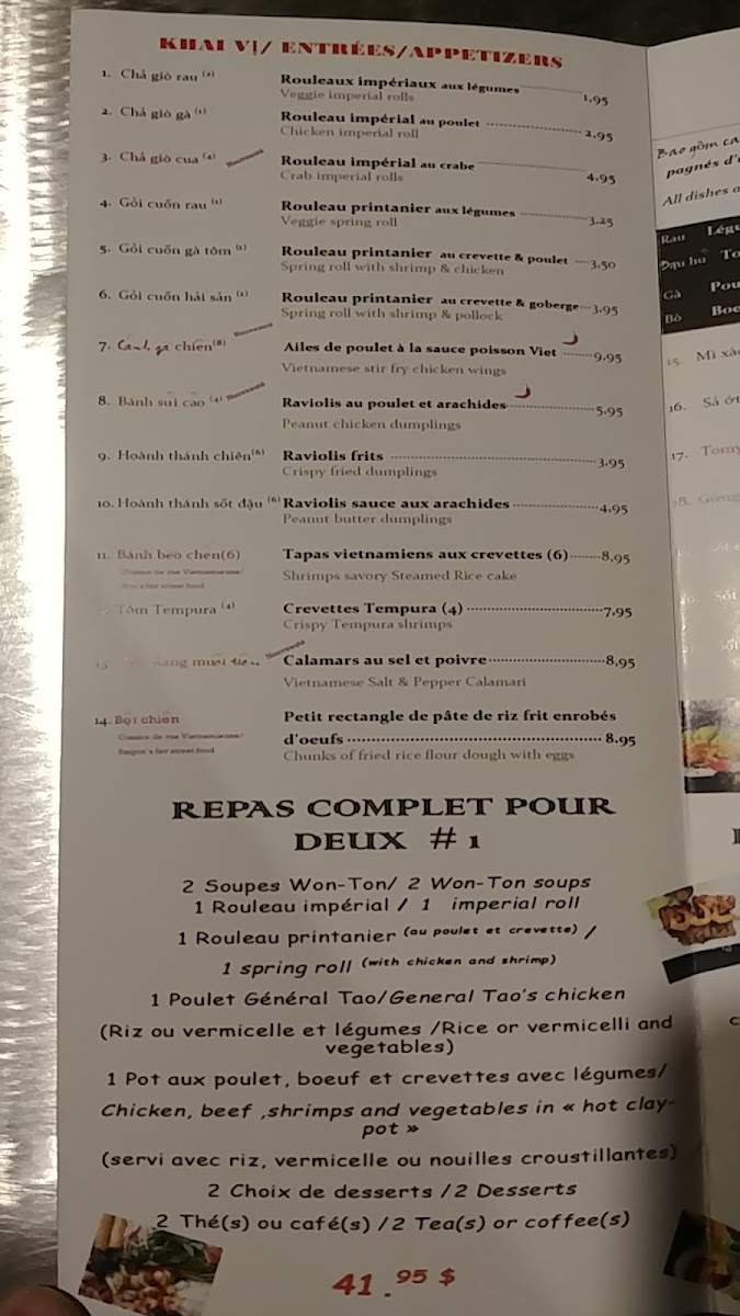 Nestled in the heart of Laval, Restaurant Vien Dong offers an exquisite taste of Vietnamese cuisine. With a focus on quality and freshness, their menu is a vibrant mix of traditional dishes that leave a lasting impression. Customers rave about the "Menu for 2," ideal for sharing, featuring generous portions and exceptional flavors.